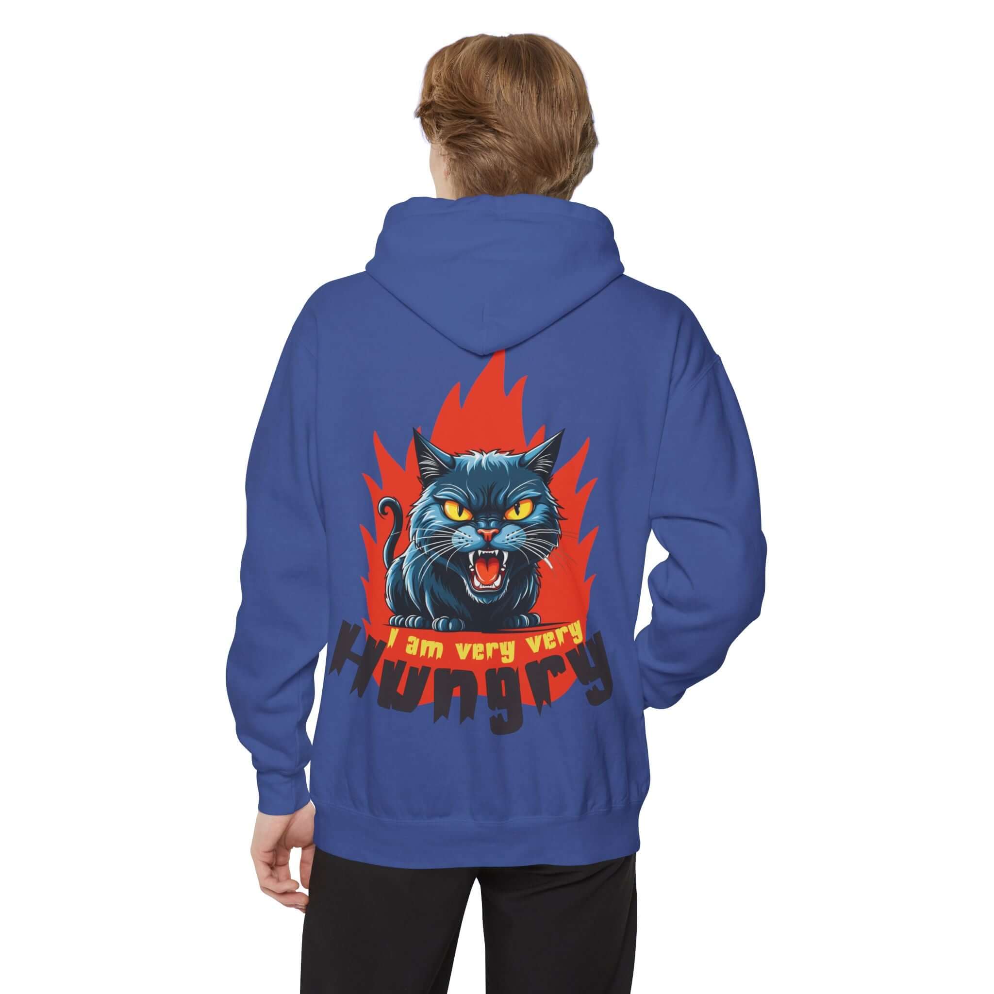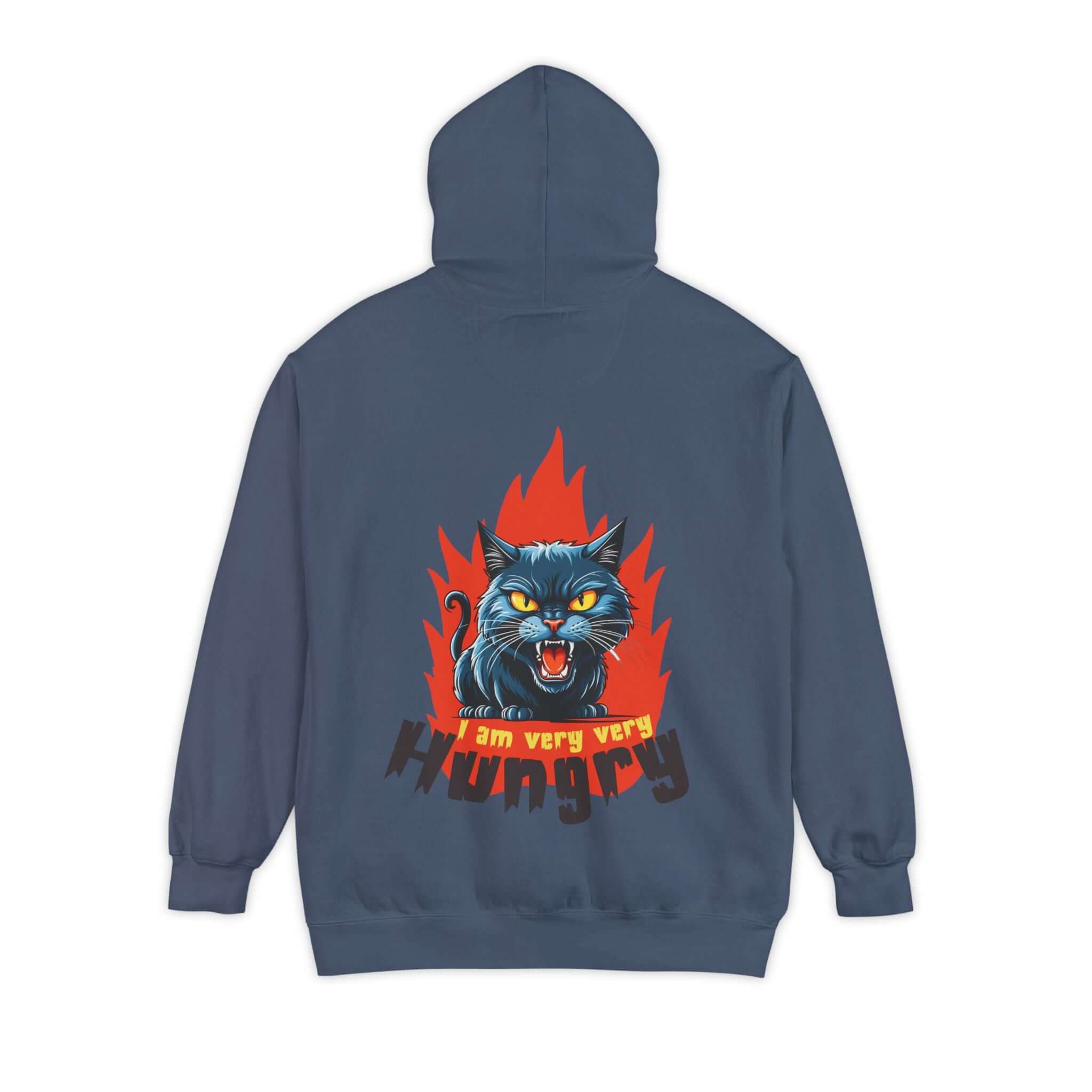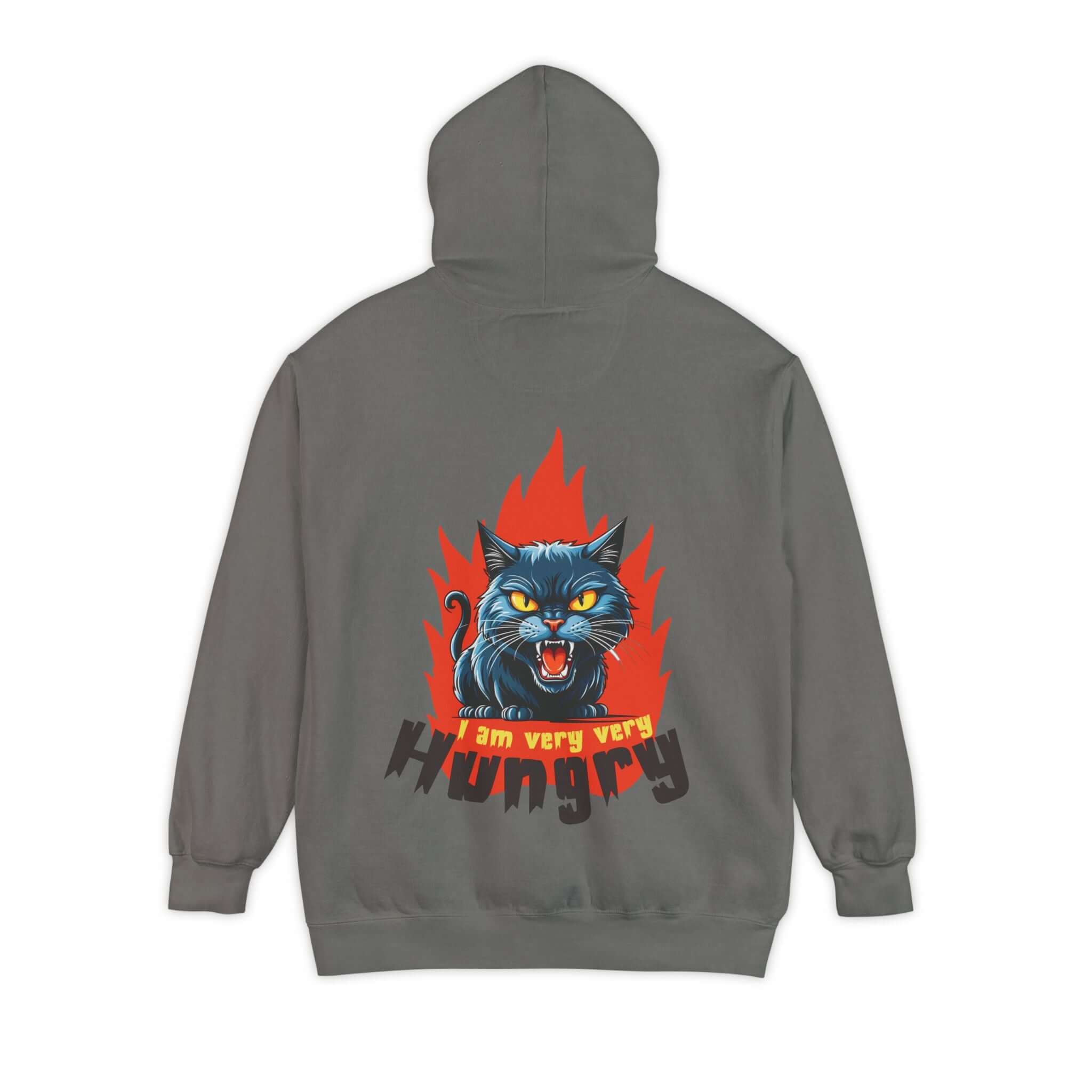 The Cartoon Cat Graphic Pullover Hoodie is crafted from a soft and durable 80/20 ringspun cotton blend, making it perfect for adding attitude to any outfit. Featuring a playful design with a snarling black cat bursting through flames and a cheekyI am very very hungrymessage, this heavyweight garment-dyed hoodie offers both style and comfort. The hoodie comes with a lined hood, flatcord drawstrings, ribbed cuffs, and a half-moon back patch for added durability. Stay cozy and express your playful side with this unique hoodie! Available in a range of sizes to 3XL. Care instructions: Machine wash cold, tumble dry low. Iron on low heat if necessary.