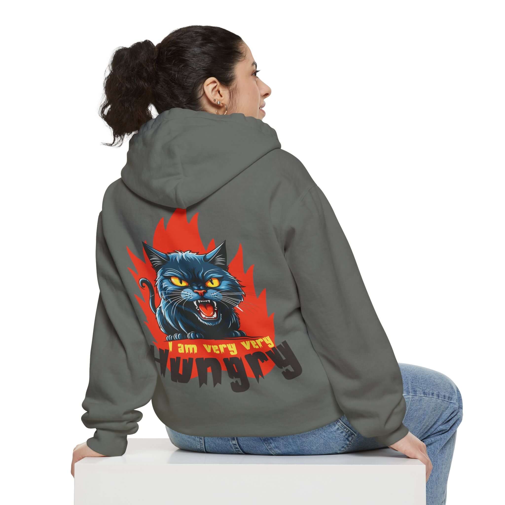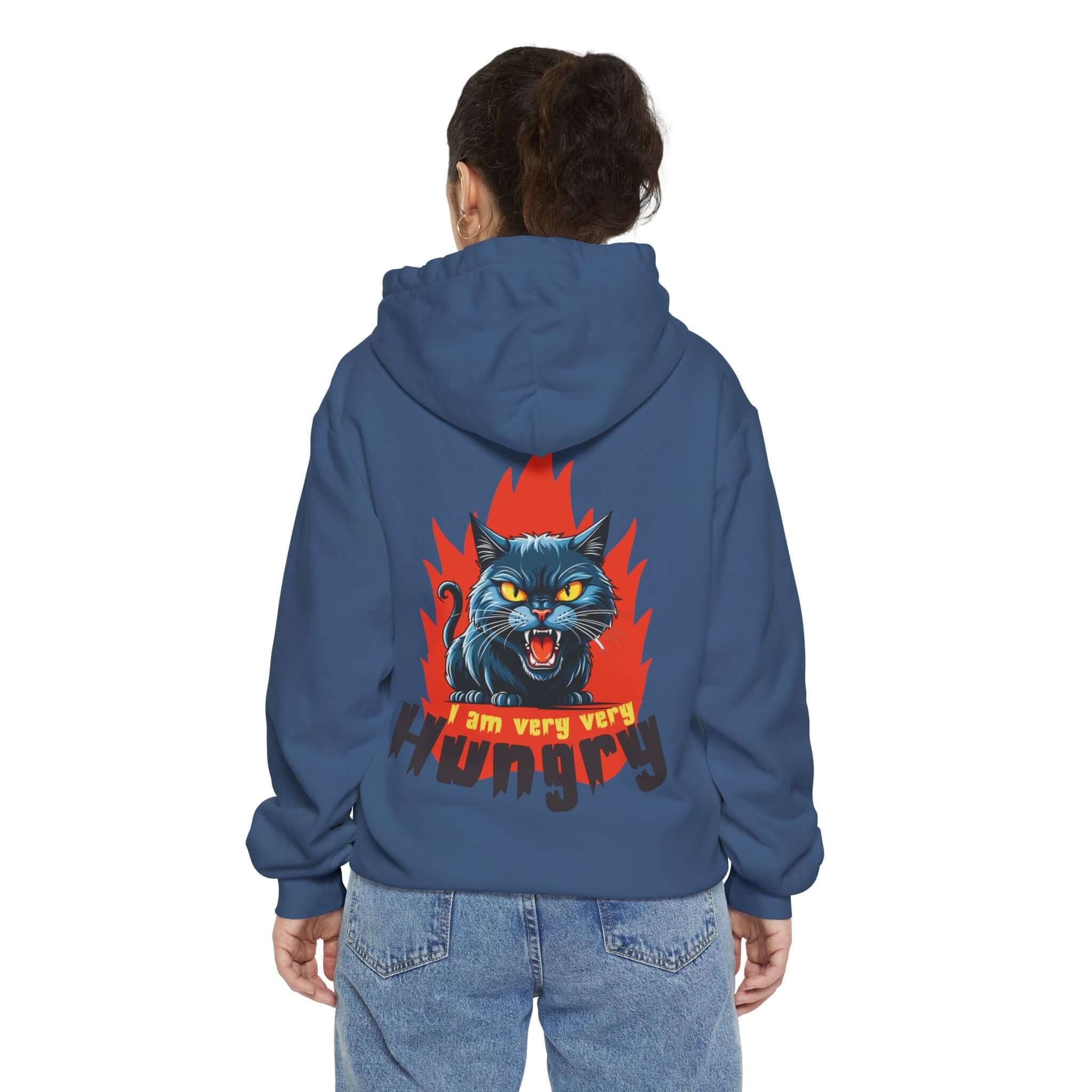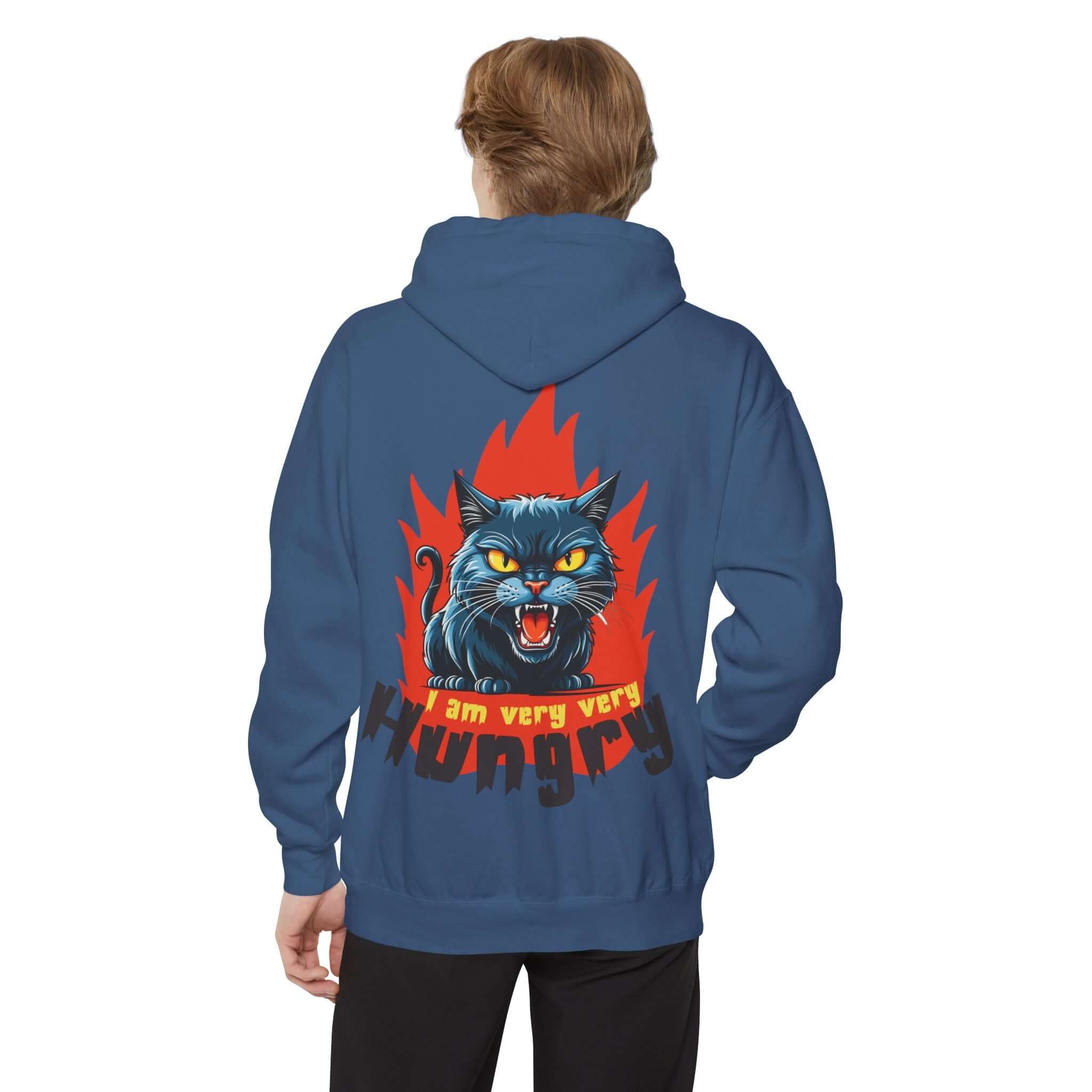 The Cartoon Cat Graphic Pullover Hoodie is crafted from a soft and durable 80/20 ringspun cotton blend, making it perfect for adding attitude to any outfit. Featuring a playful design with a snarling black cat bursting through flames and a cheekyI am very very hungrymessage, this heavyweight garment-dyed hoodie offers both style and comfort. The hoodie comes with a lined hood, flatcord drawstrings, ribbed cuffs, and a half-moon back patch for added durability. Stay cozy and express your playful side with this unique hoodie! Available in a range of sizes to 3XL. Care instructions: Machine wash cold, tumble dry low. Iron on low heat if necessary.