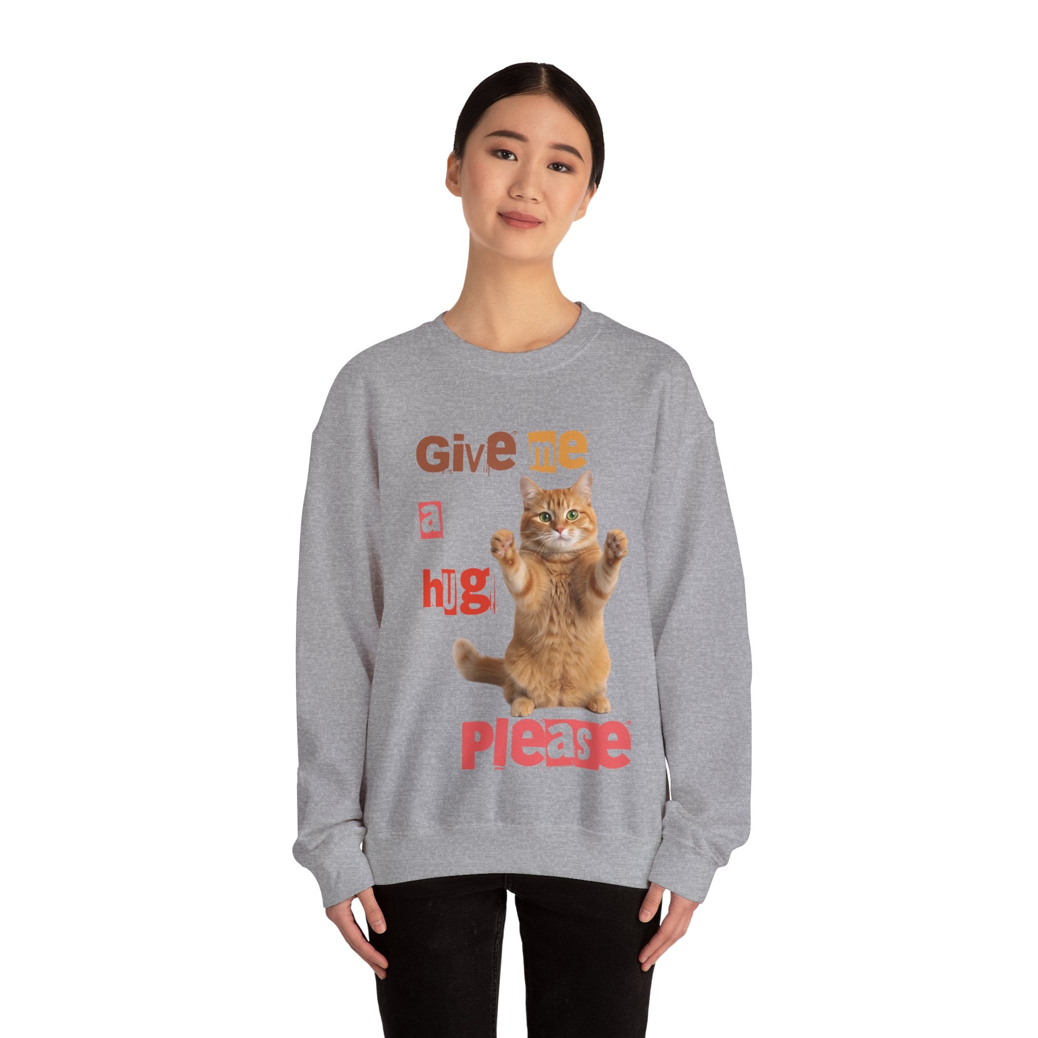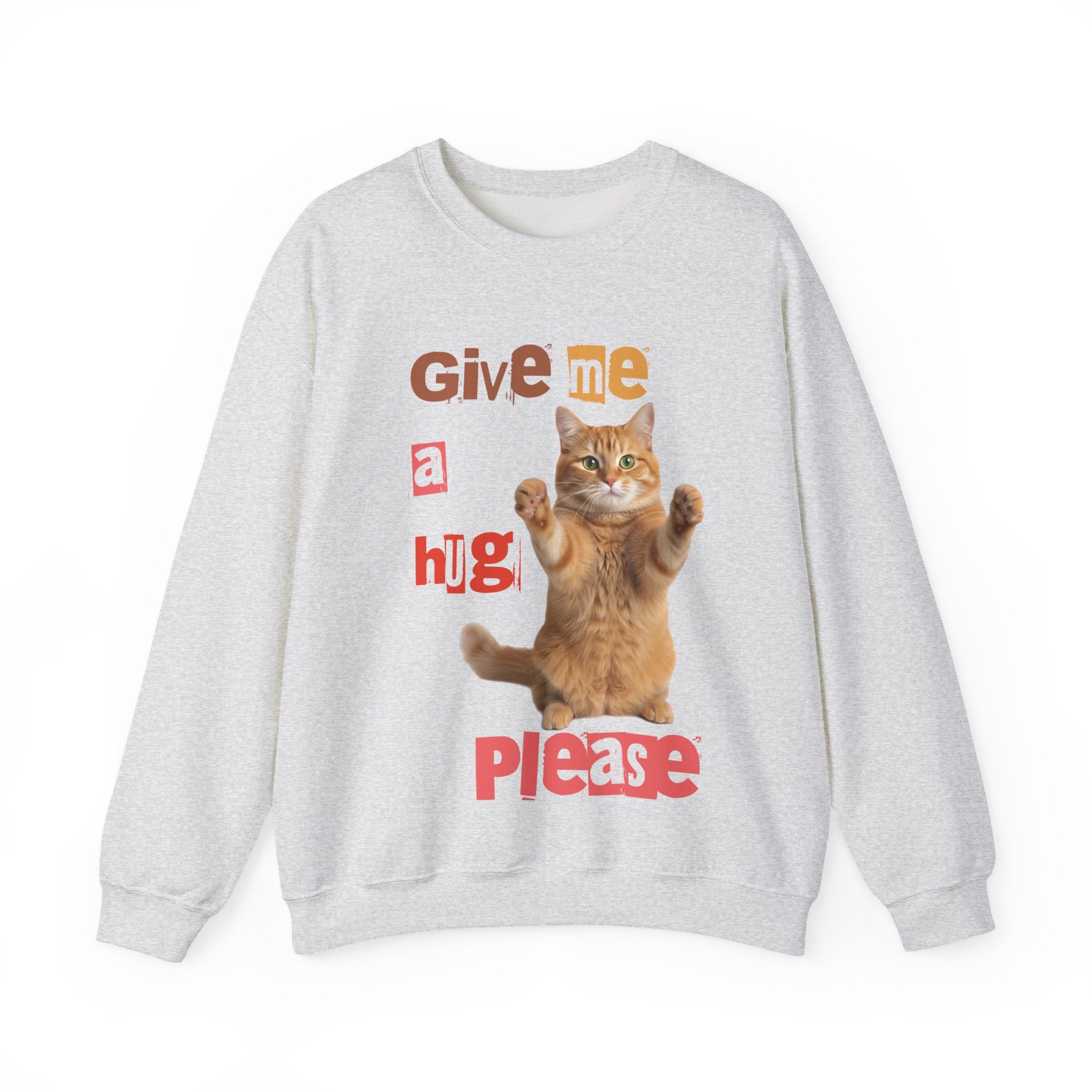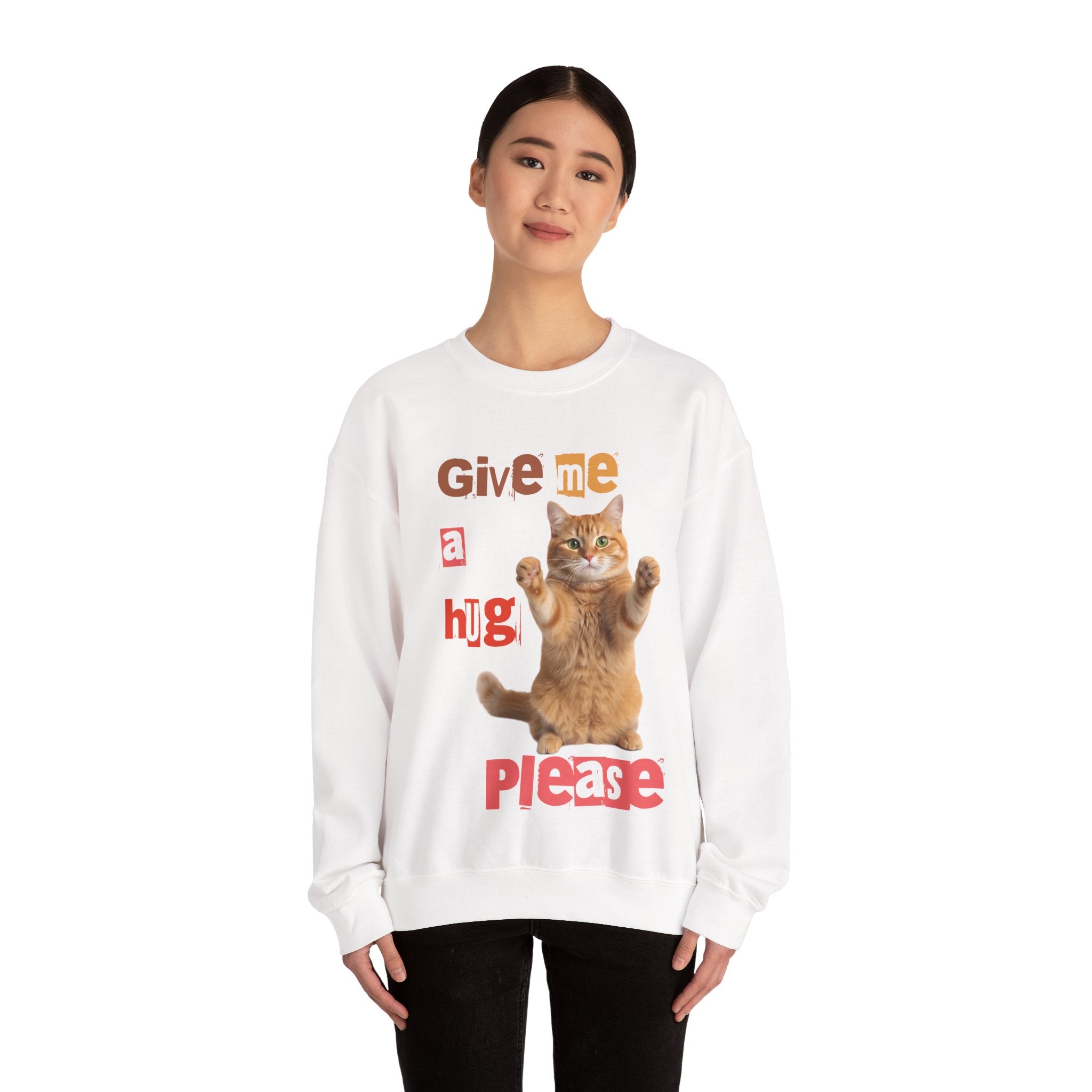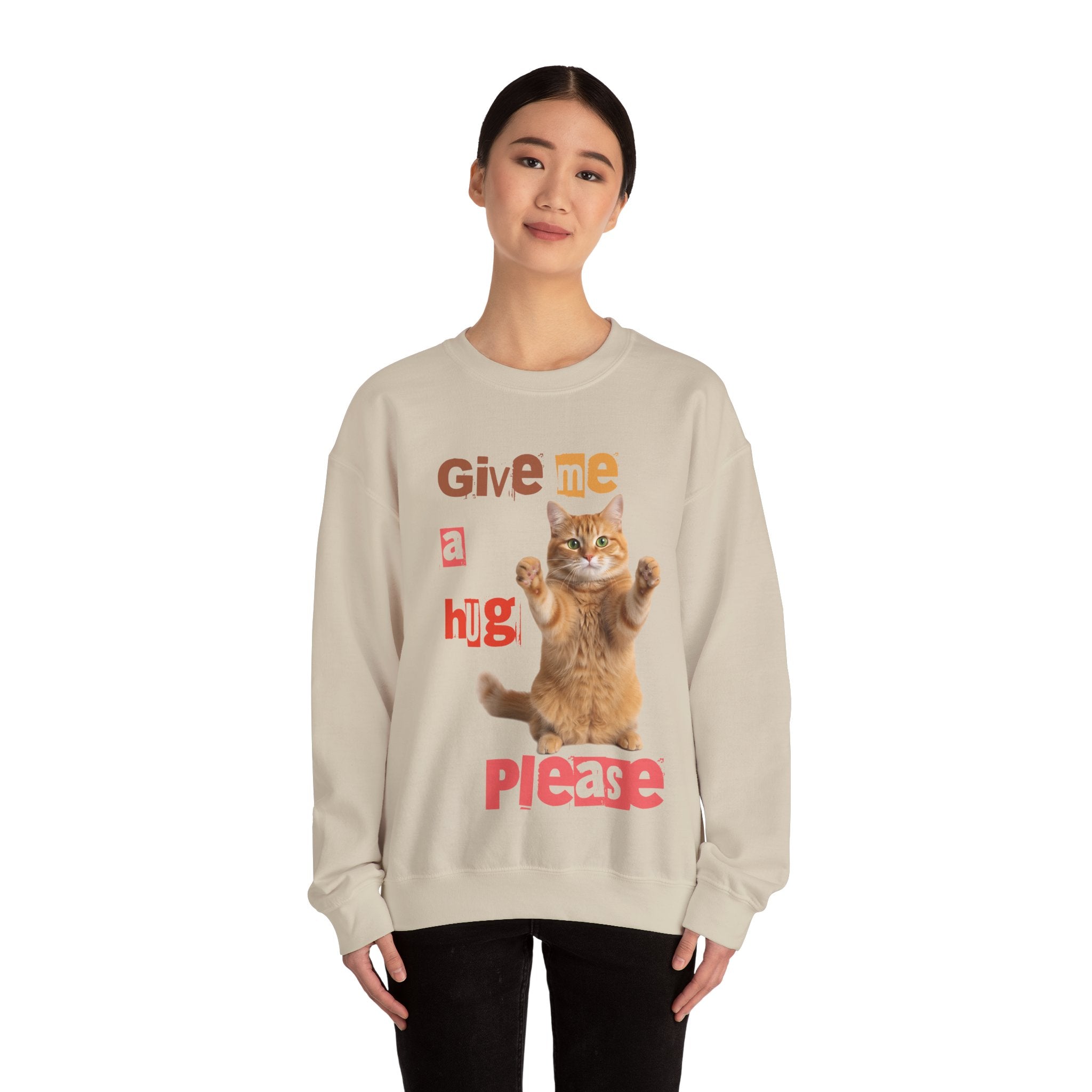 Indulge in warmth and playfulness with this Cat Hug Crewneck Sweatshirt. Featuring a charming ginger cat reaching out for a hug amidst hand-cut lettering that readsGive me a hug, please.This midweight sweatshirt made of a 50/50 cotton–poly blend ensures comfort and durability for everyday wear. The classic crew neckline and double-needle stitching provide lasting shape and strength. Perfect for layering on cool mornings or lounging on lazy afternoons, this cozy piece is also OEKO-TEX certified. Treat yourself or someone special to a piece of nostalgia and comfort. Available in sizes S, M, L, XL, 2XL, 3XL, and various colors.