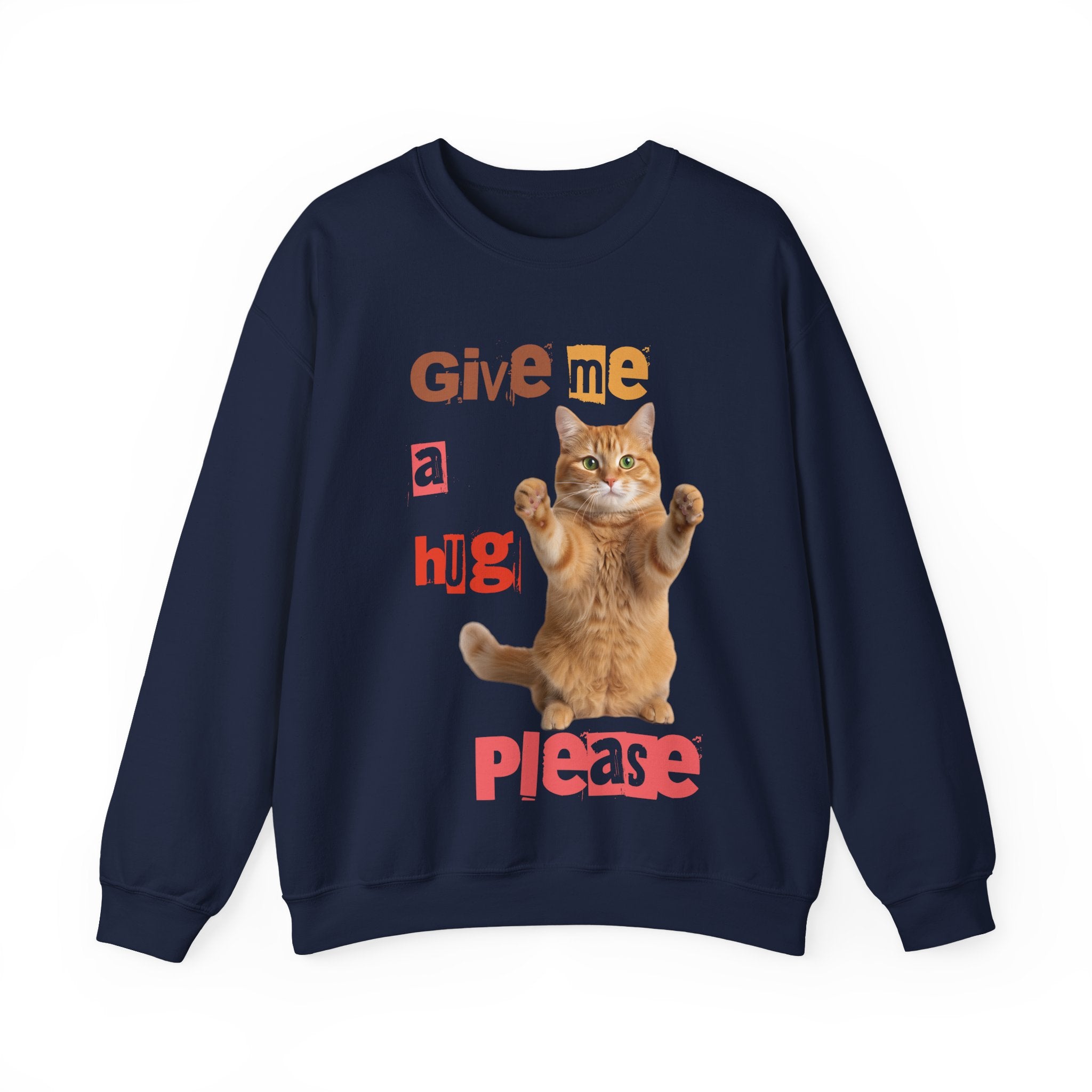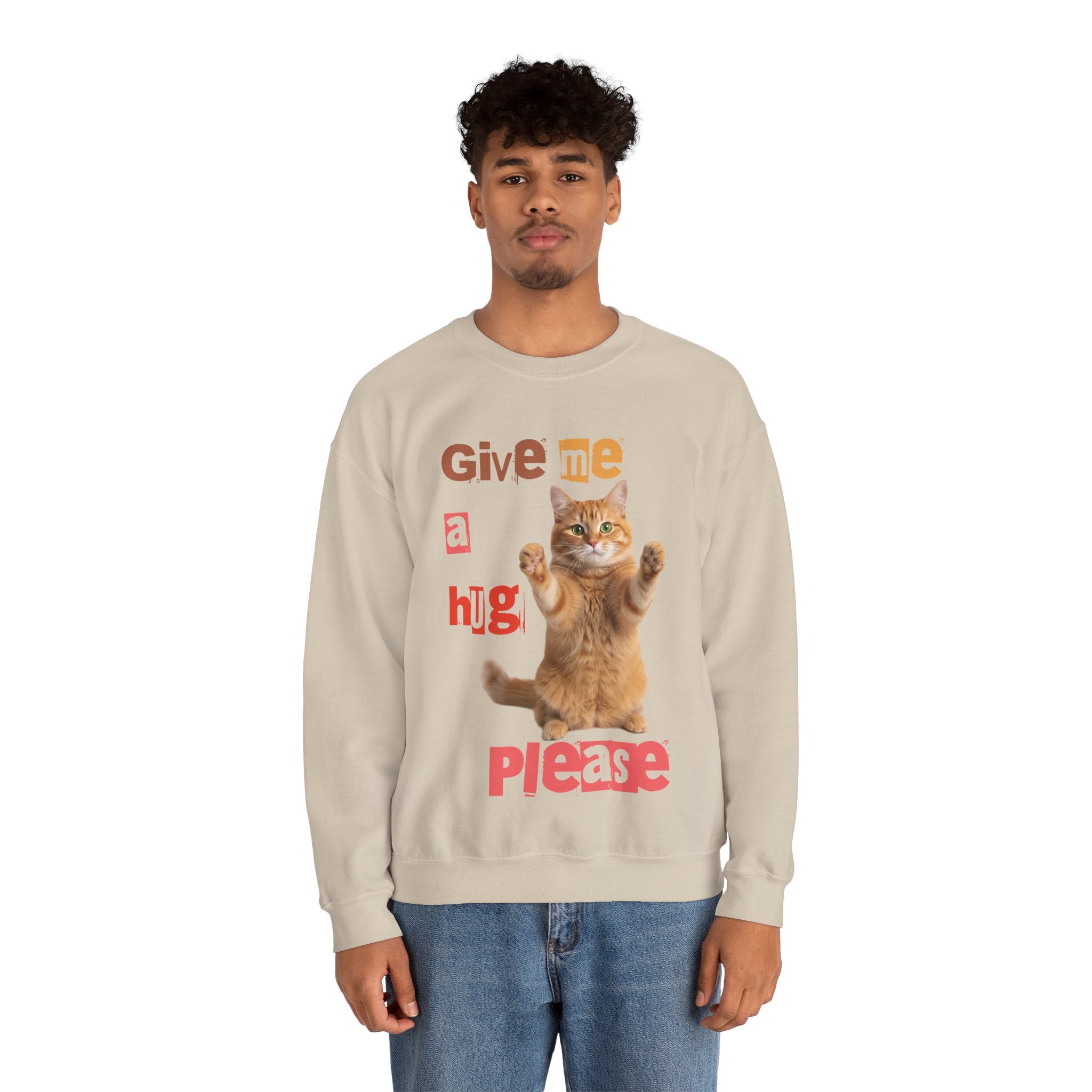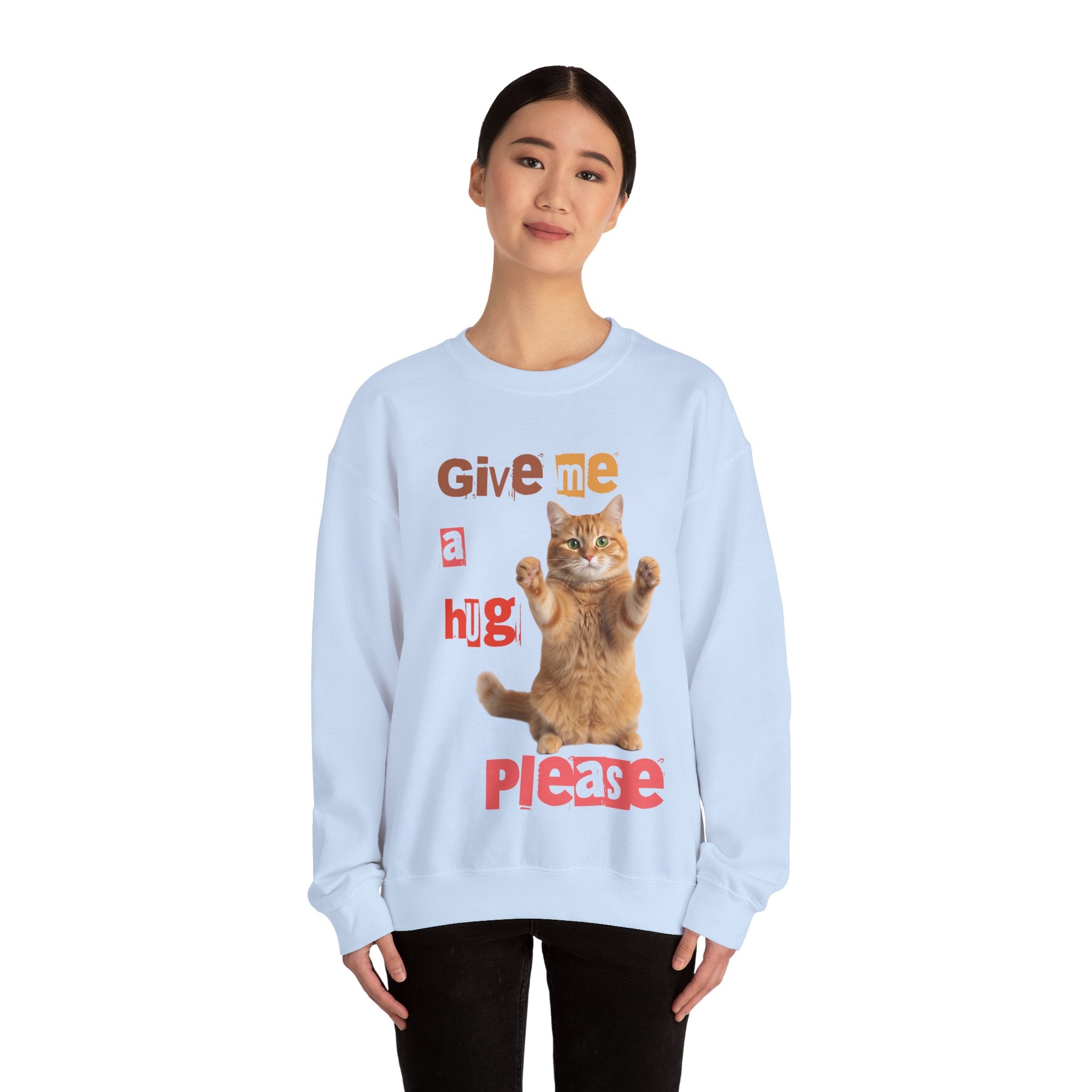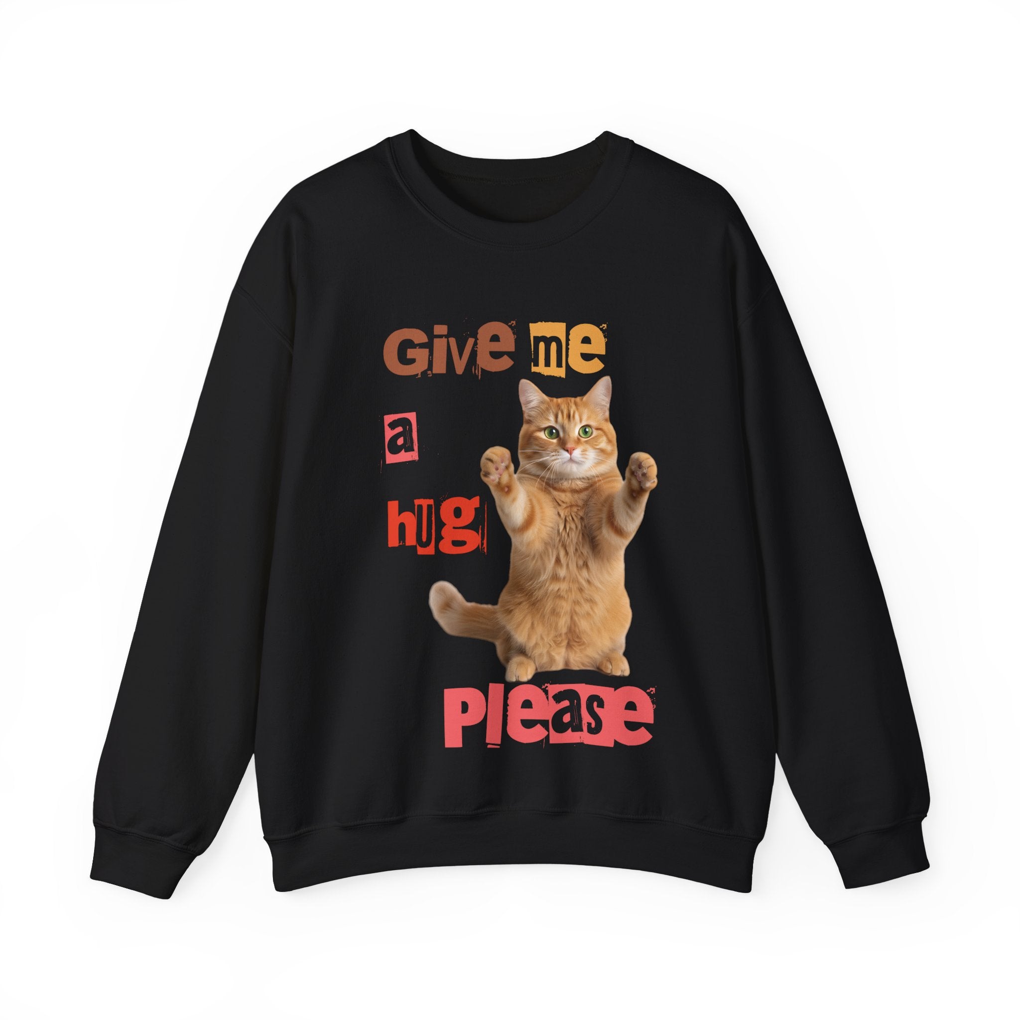 Indulge in warmth and playfulness with this Cat Hug Crewneck Sweatshirt. Featuring a charming ginger cat reaching out for a hug amidst hand-cut lettering that readsGive me a hug, please.This midweight sweatshirt made of a 50/50 cotton–poly blend ensures comfort and durability for everyday wear. The classic crew neckline and double-needle stitching provide lasting shape and strength. Perfect for layering on cool mornings or lounging on lazy afternoons, this cozy piece is also OEKO-TEX certified. Treat yourself or someone special to a piece of nostalgia and comfort. Available in sizes S, M, L, XL, 2XL, 3XL, and various colors.