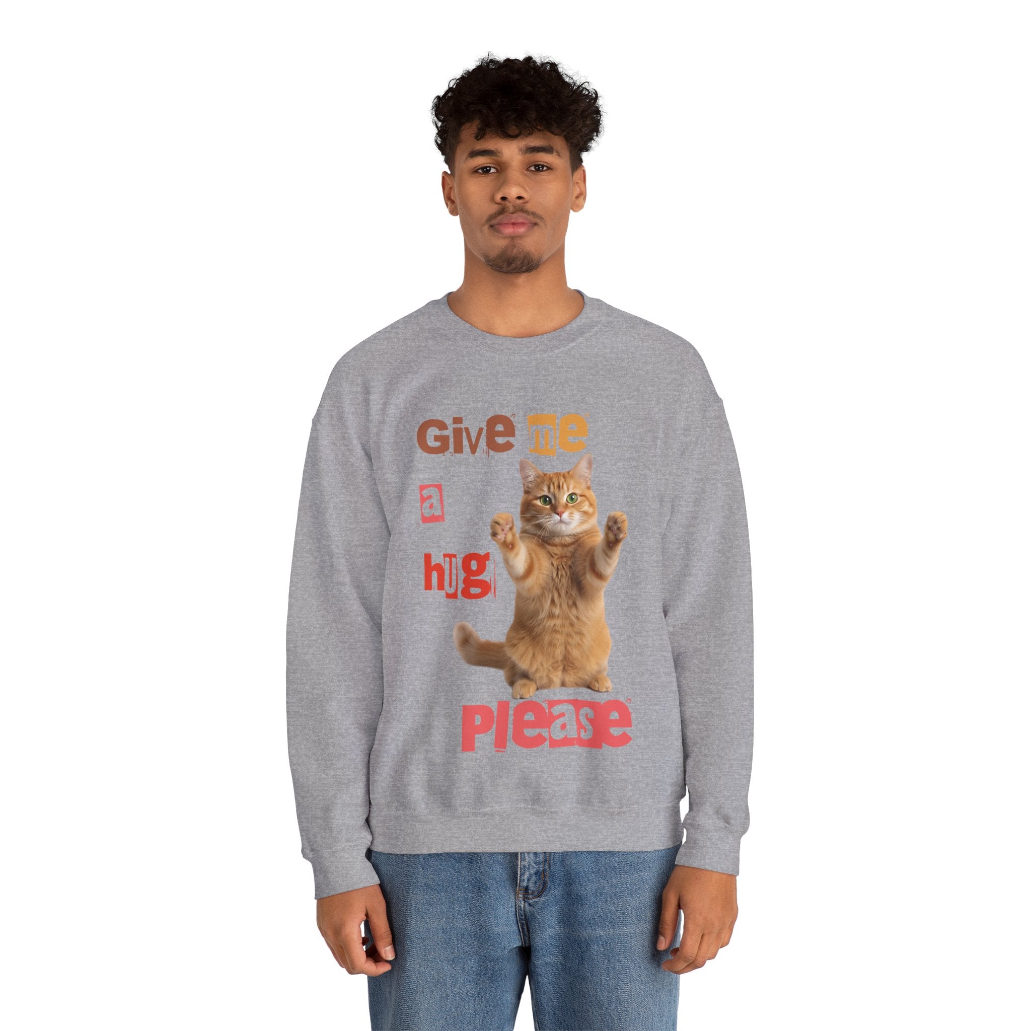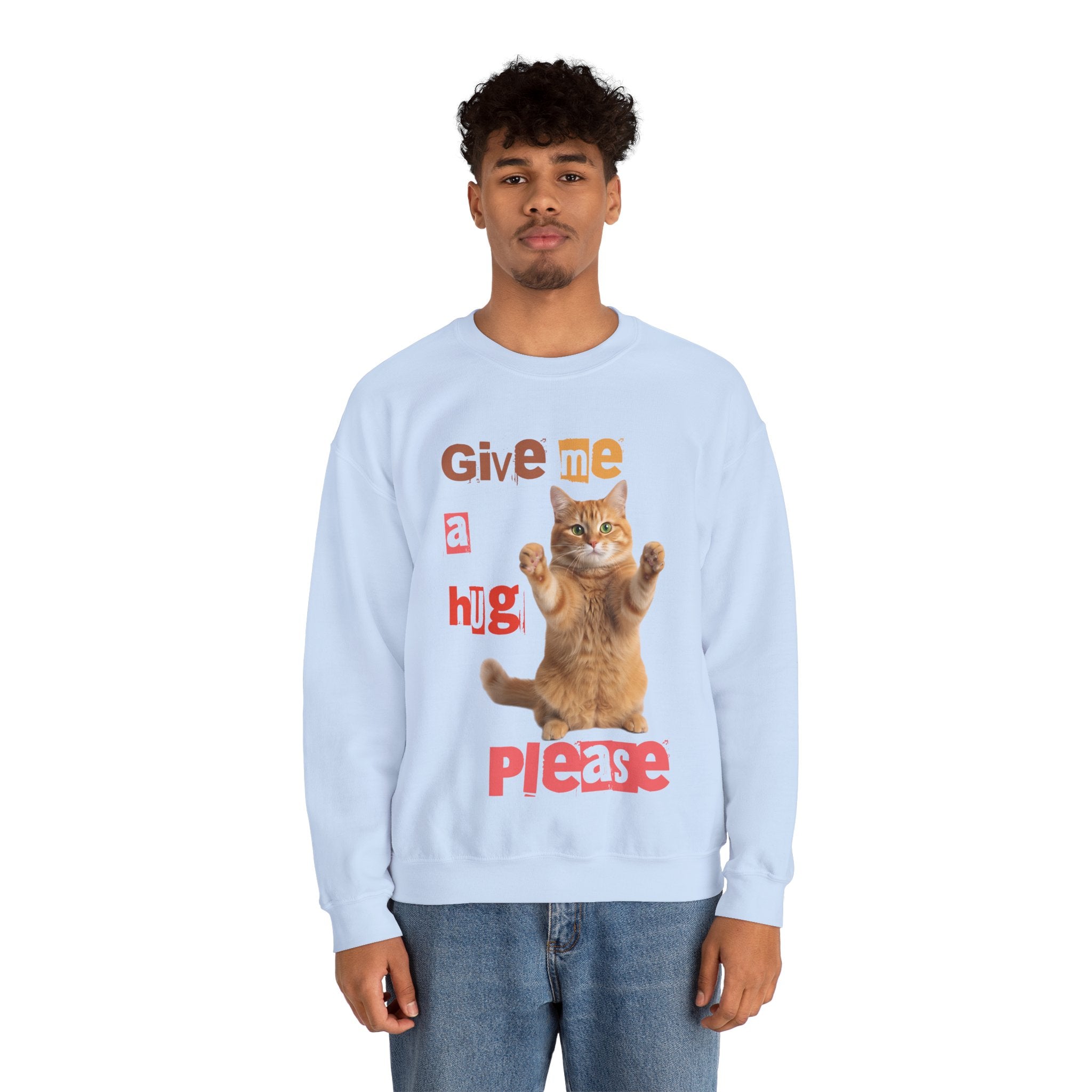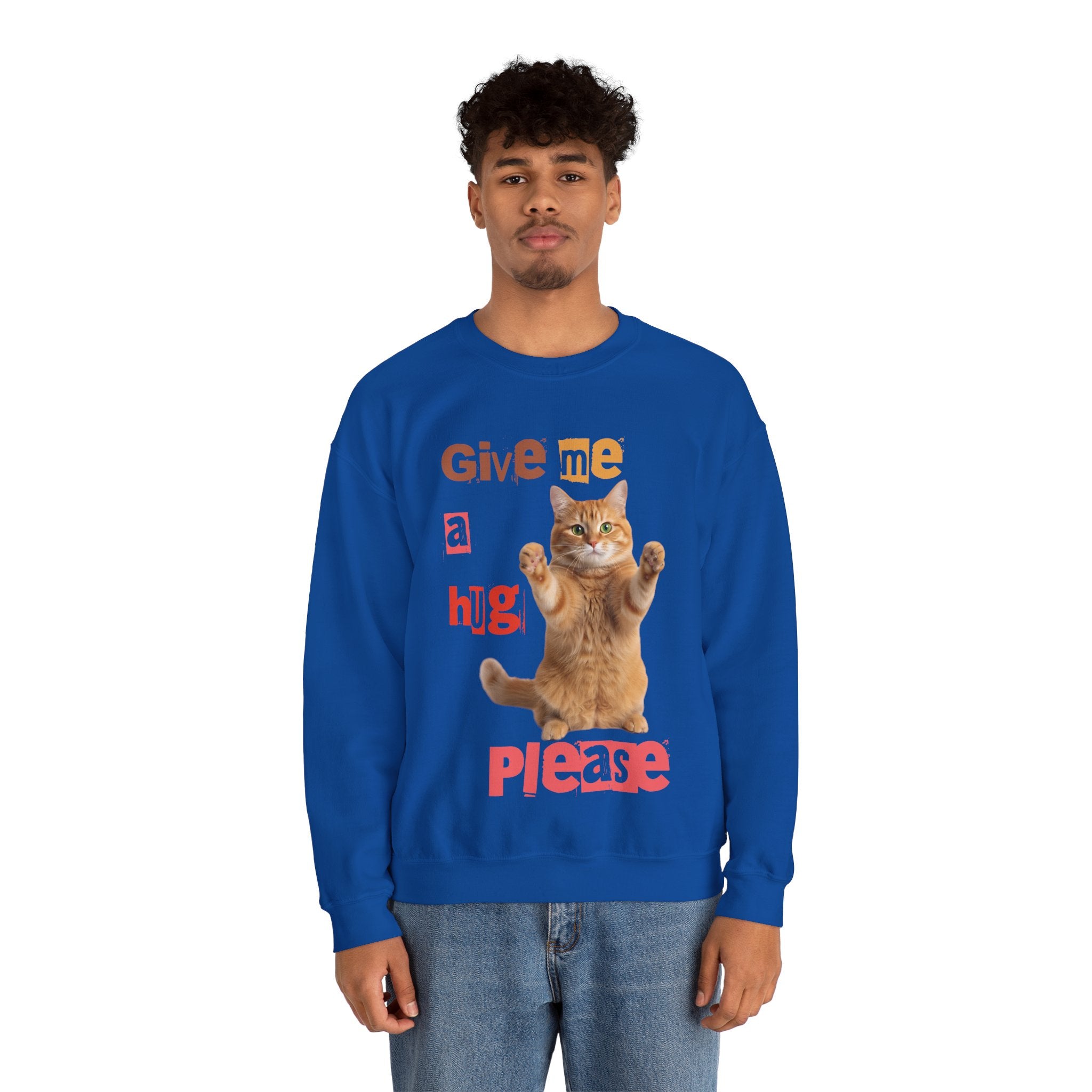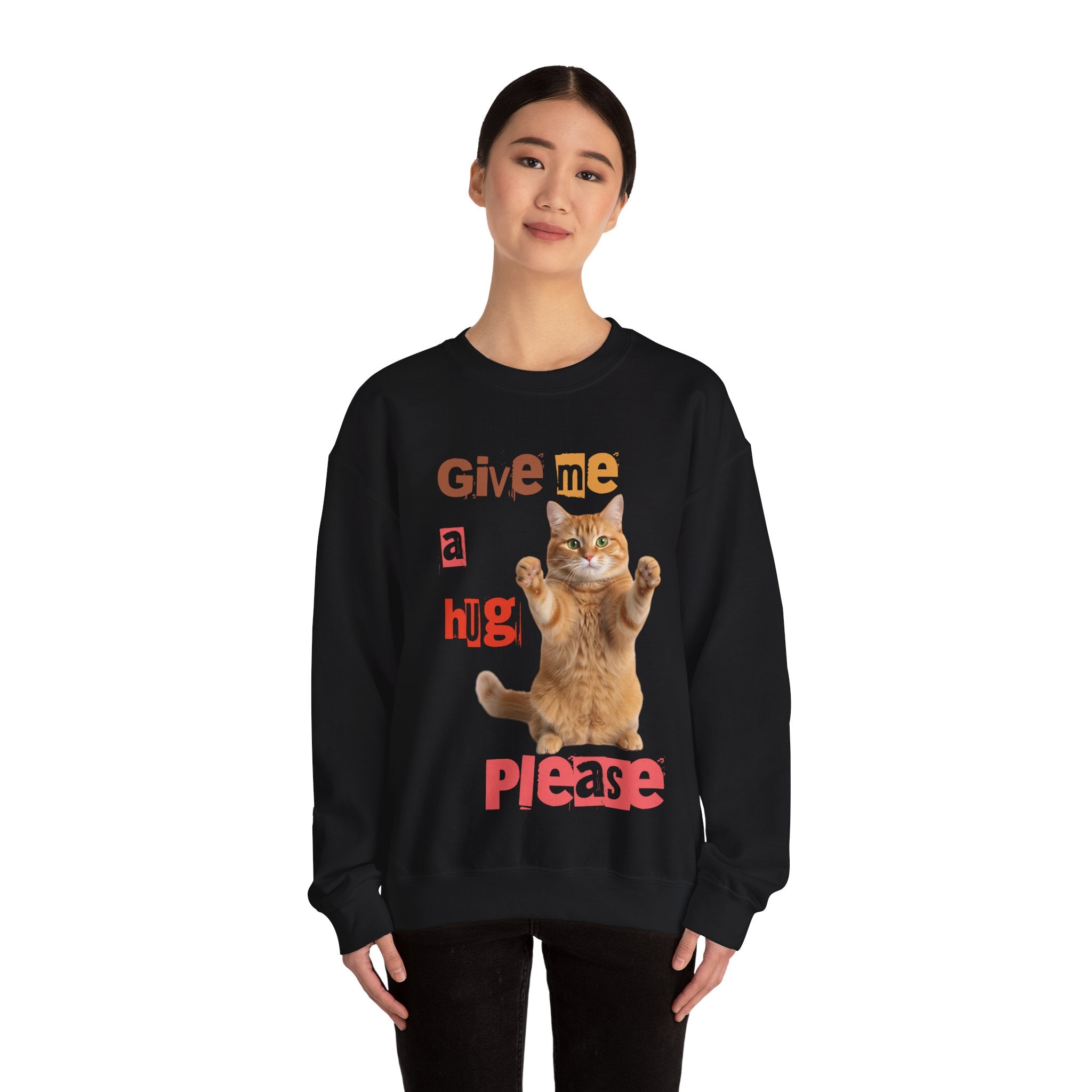 Indulge in warmth and playfulness with this Cat Hug Crewneck Sweatshirt. Featuring a charming ginger cat reaching out for a hug amidst hand-cut lettering that readsGive me a hug, please.This midweight sweatshirt made of a 50/50 cotton–poly blend ensures comfort and durability for everyday wear. The classic crew neckline and double-needle stitching provide lasting shape and strength. Perfect for layering on cool mornings or lounging on lazy afternoons, this cozy piece is also OEKO-TEX certified. Treat yourself or someone special to a piece of nostalgia and comfort. Available in sizes S, M, L, XL, 2XL, 3XL, and various colors.