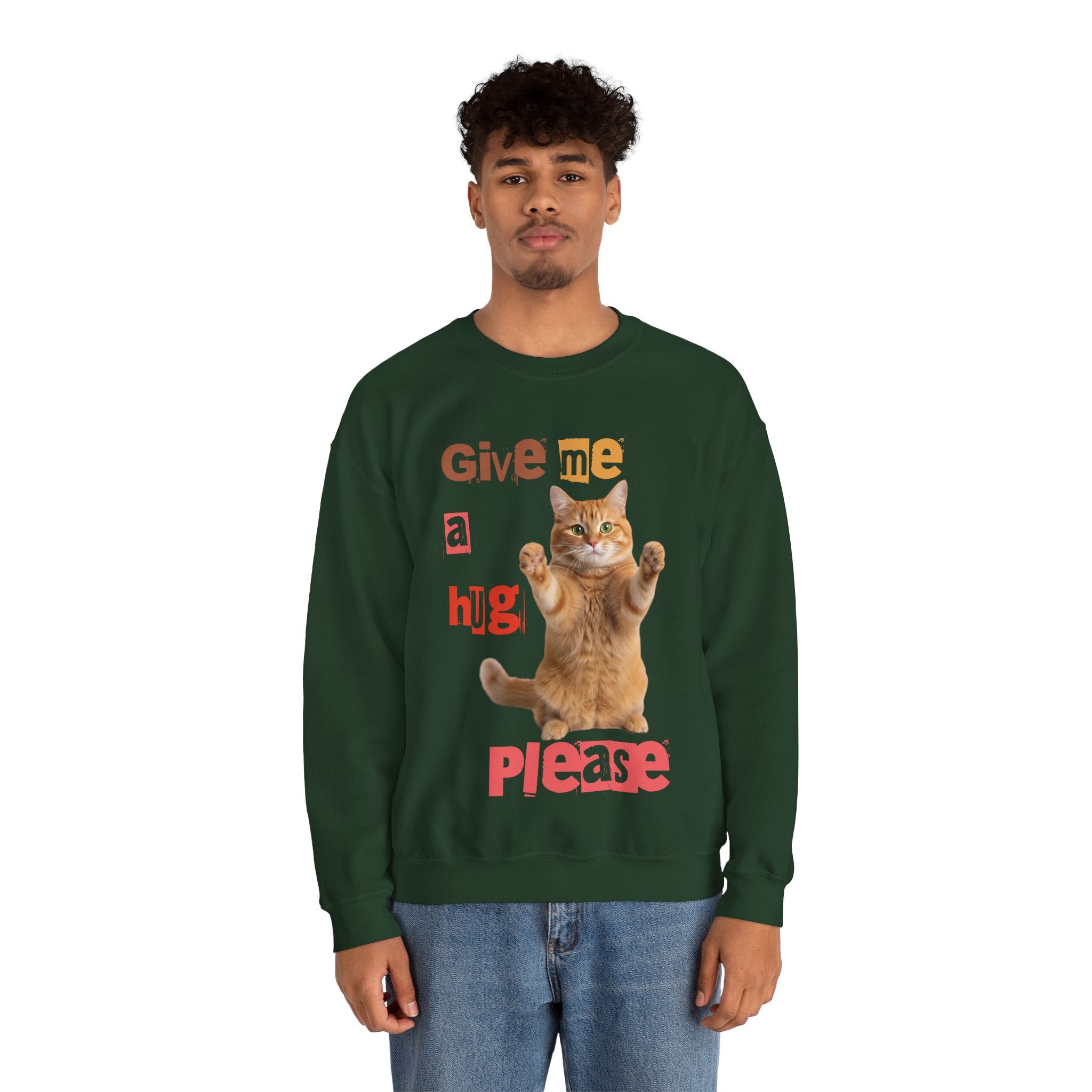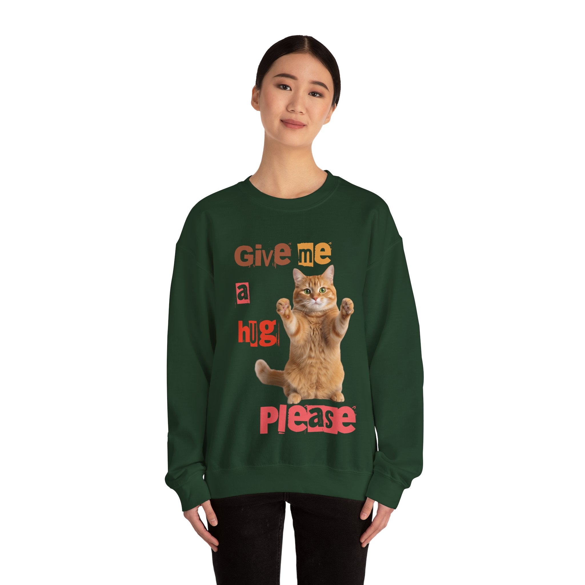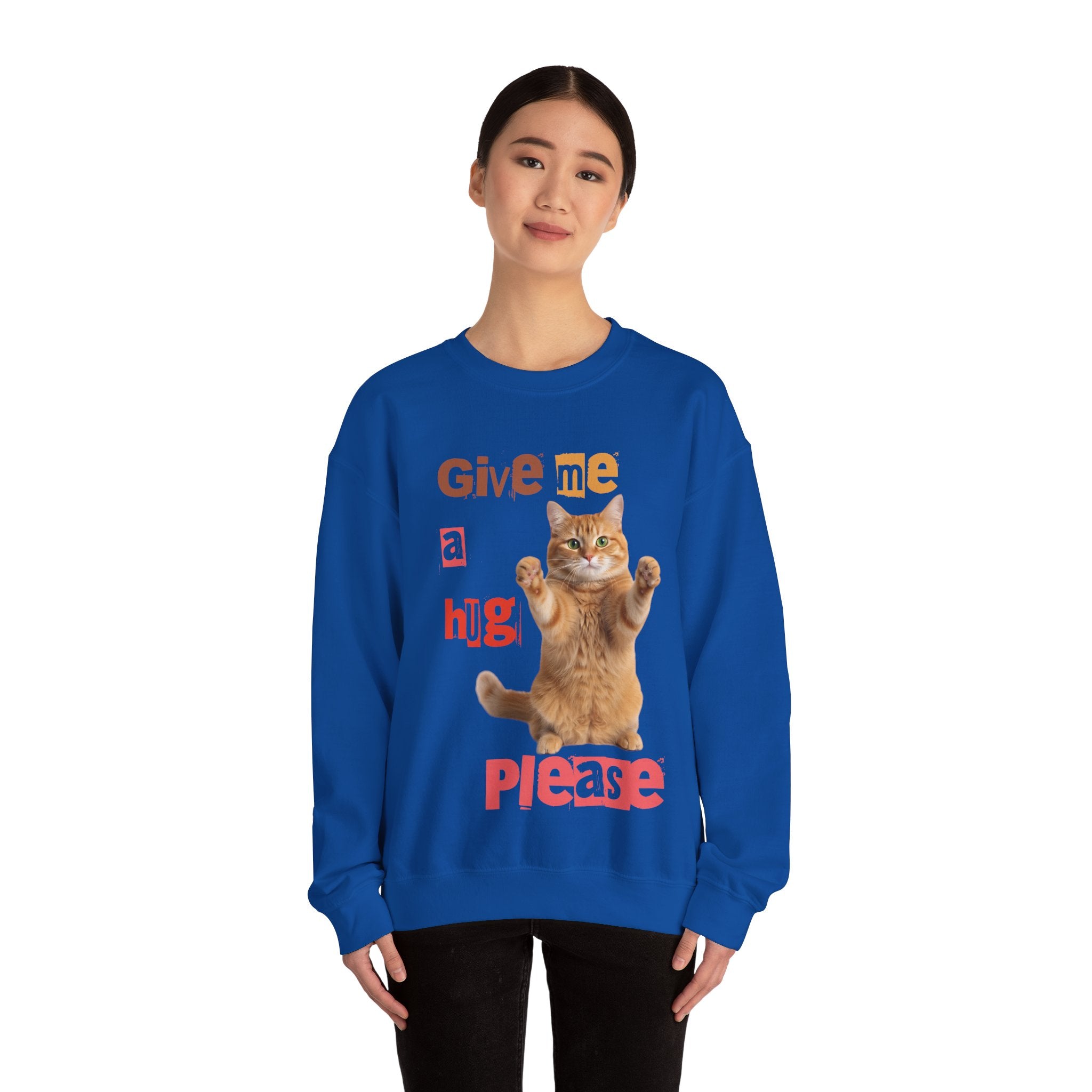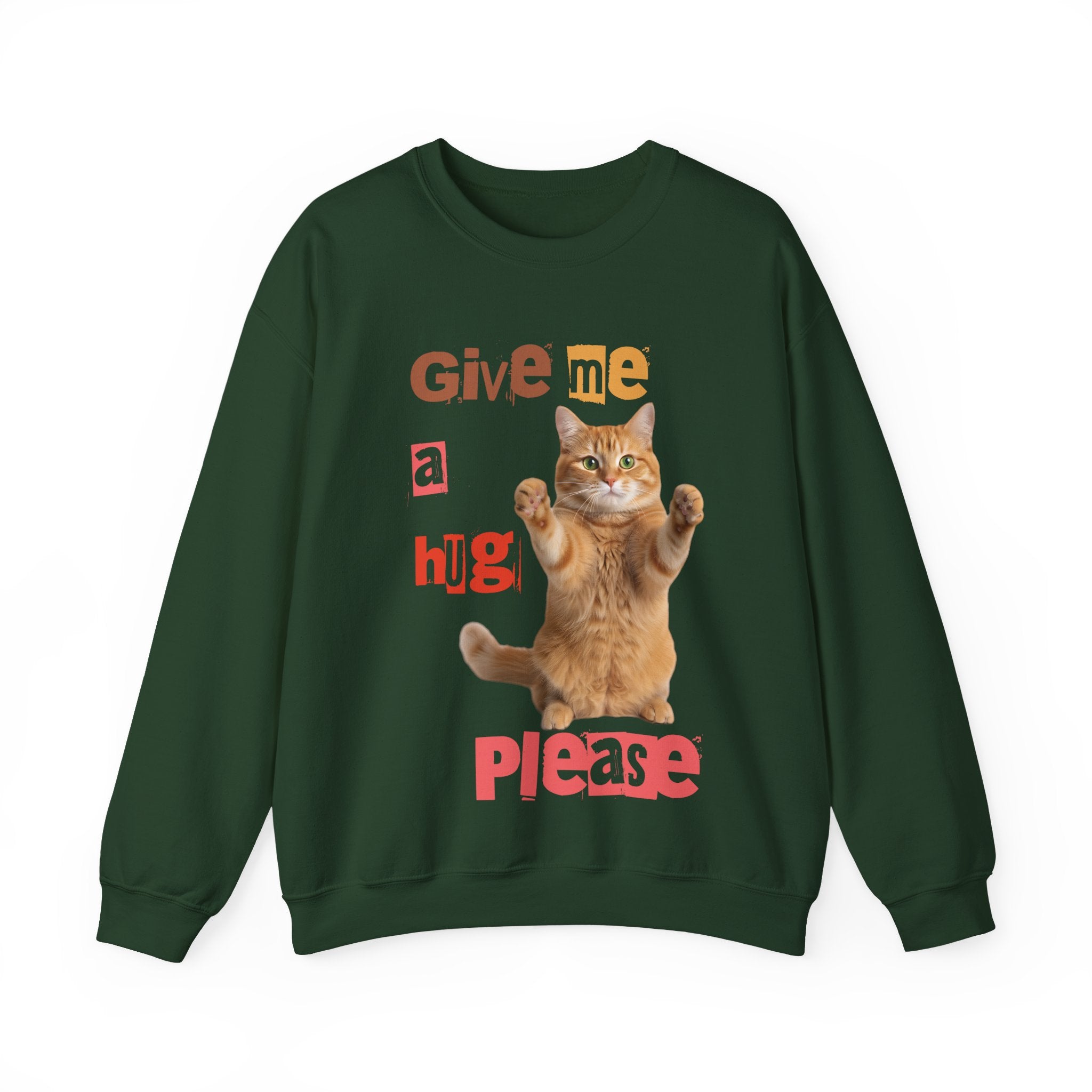 Indulge in warmth and playfulness with this Cat Hug Crewneck Sweatshirt. Featuring a charming ginger cat reaching out for a hug amidst hand-cut lettering that readsGive me a hug, please.This midweight sweatshirt made of a 50/50 cotton–poly blend ensures comfort and durability for everyday wear. The classic crew neckline and double-needle stitching provide lasting shape and strength. Perfect for layering on cool mornings or lounging on lazy afternoons, this cozy piece is also OEKO-TEX certified. Treat yourself or someone special to a piece of nostalgia and comfort. Available in sizes S, M, L, XL, 2XL, 3XL, and various colors.