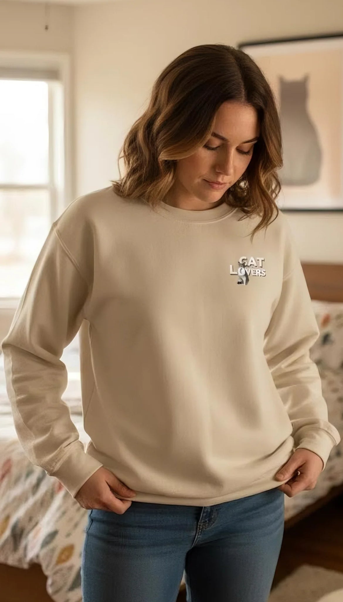 The Embroidered Cat Lover Unisex Crewneck Sweatshirt is crafted for those appreciating minimalist artistry. This versatile and slightly oversized sweatshirt provides comfort throughout your day. Made with midweight 50/50 cotton-poly fabric, it offers warmth without bulk, making it perfect for various activities. The tubular, seam-free knit construction and ribbed collar ensure durability and a smooth fit. Layer it under a coat or pair it with jeans for a casual yet stylish look that is ideal for slow walks, studio sessions, or late-night reading. This wardrobe staple is a blend of quiet elegance and casual coziness, becoming your go-to piece effortlessly. Care instructions: machine wash cold, do not bleach, tumble dry on low heat, do not iron, do not dry clean.