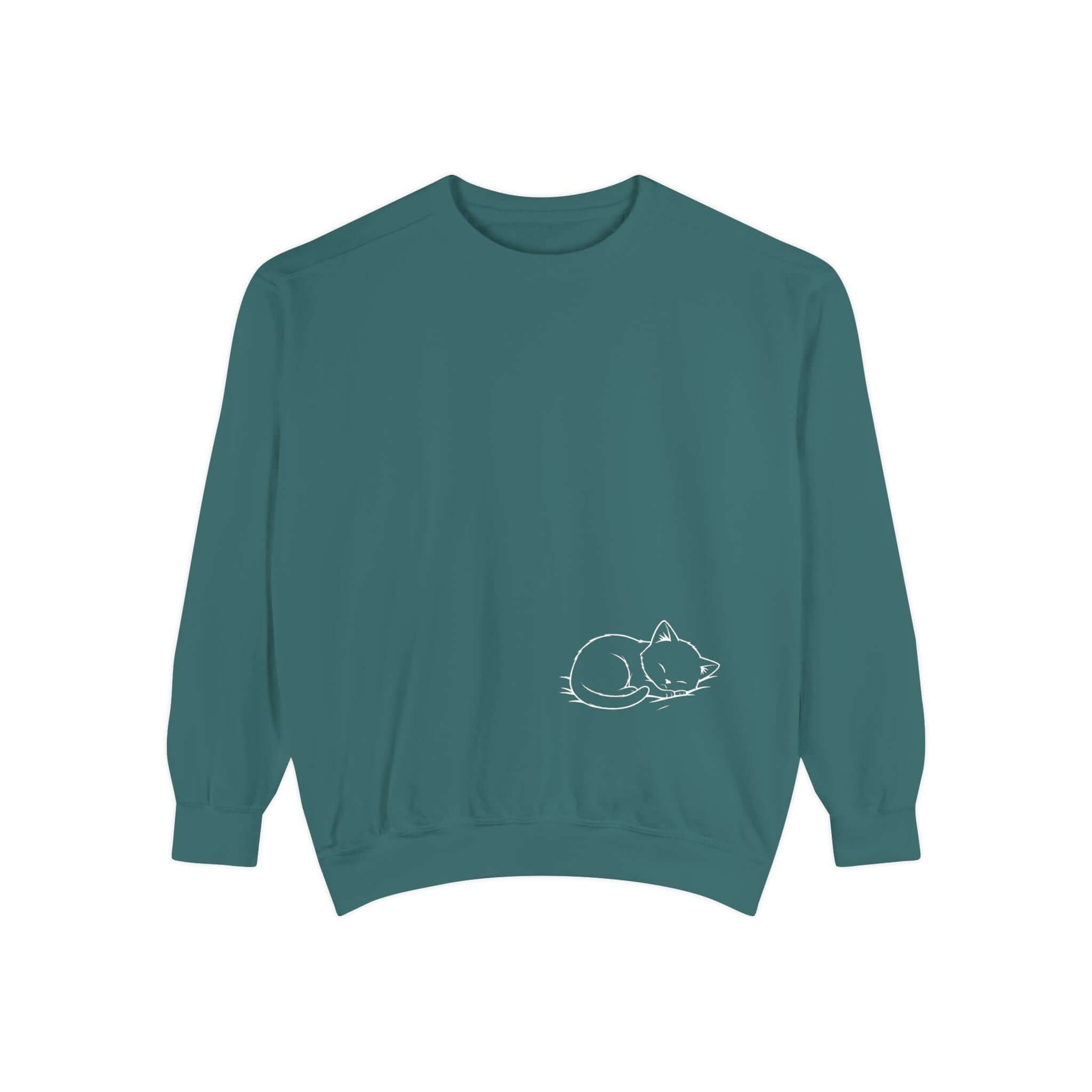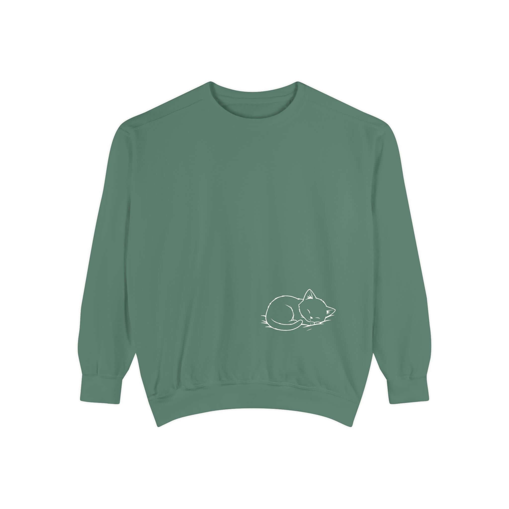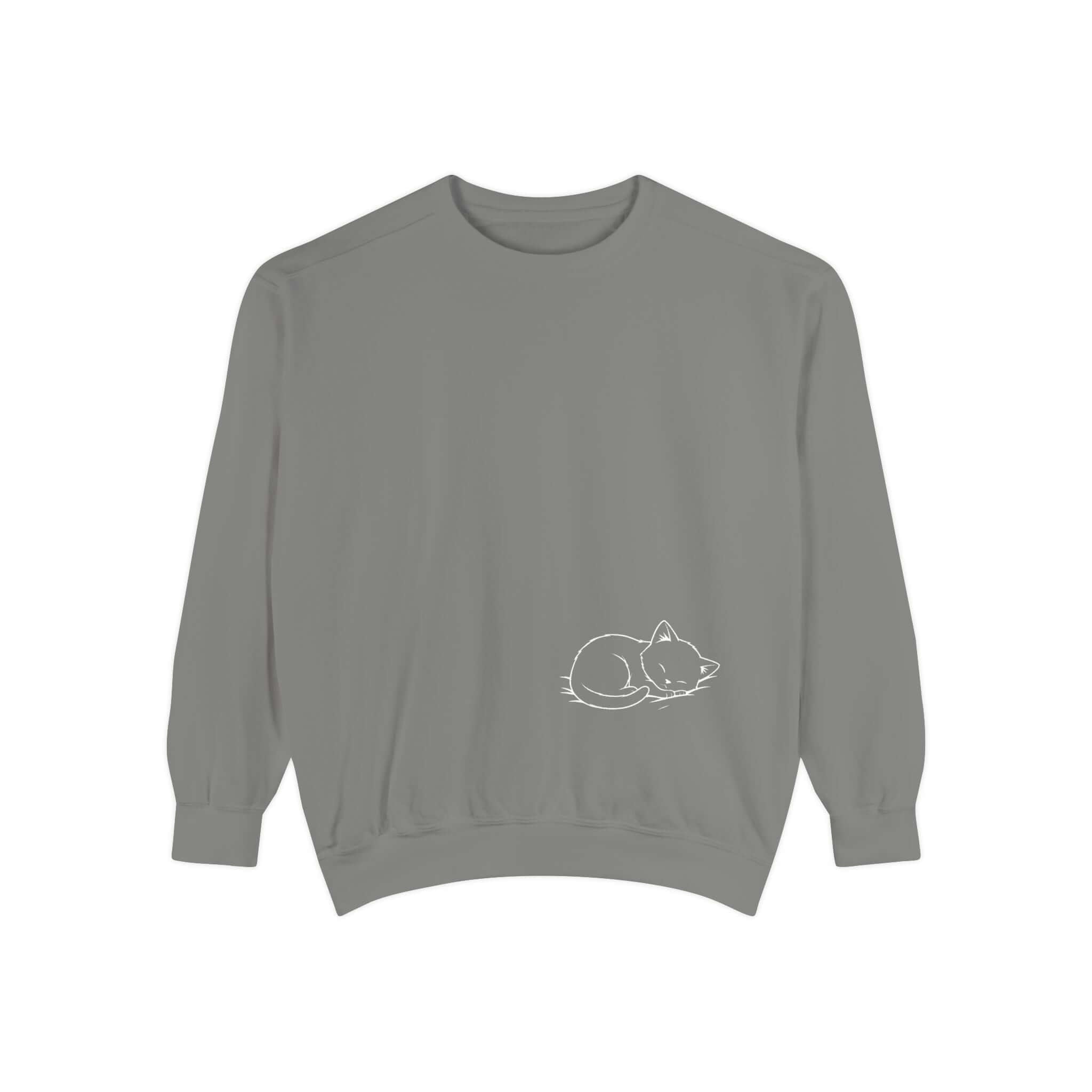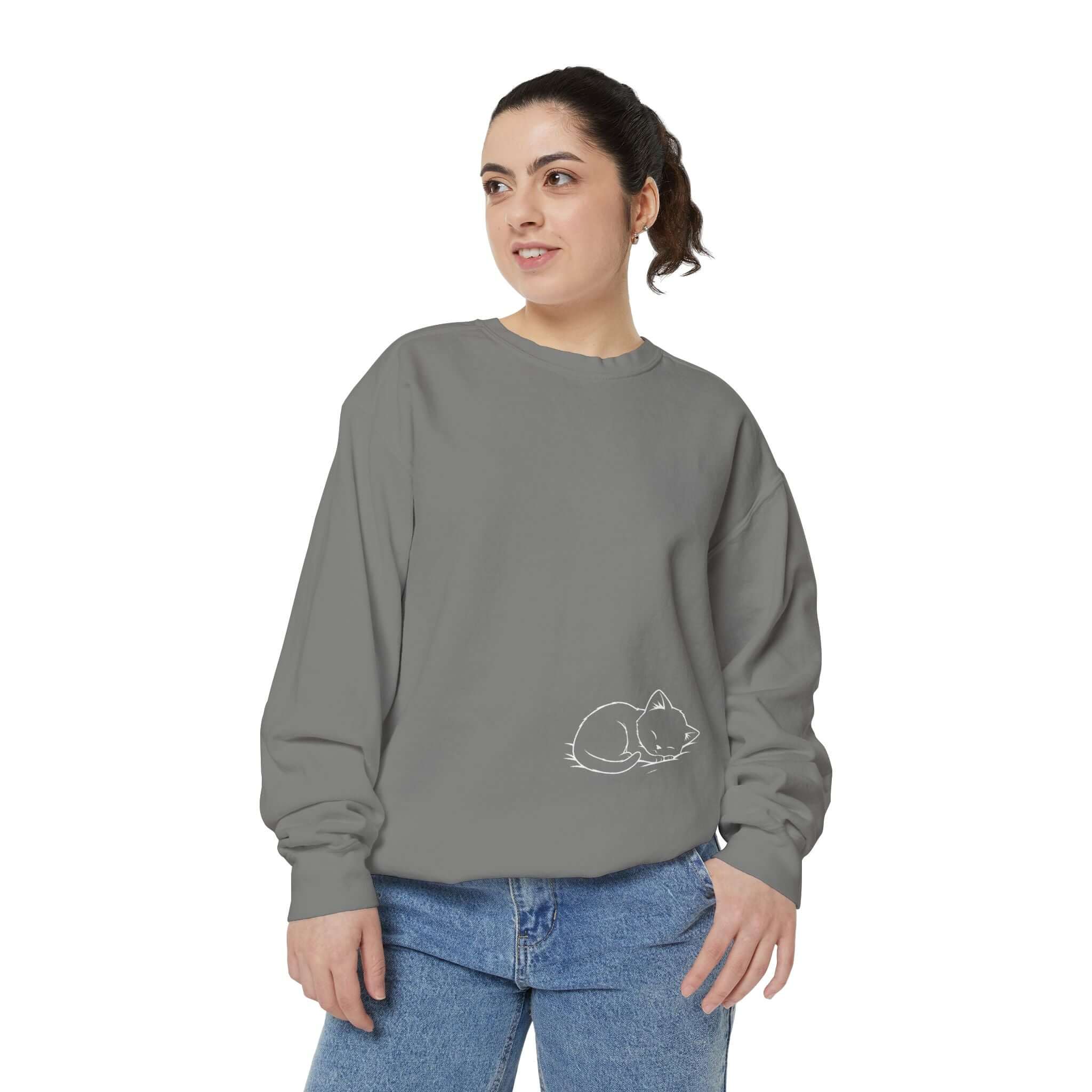 Enjoy the soothing comfort of the Graphic Cat Print Unisex Crewneck Sweatshirt in White. This garment-dyed sweatshirt blends medium-heavy 80/20 ring-spun cotton-poly for a durable yet soft touch. The ribbed collar, cuffs, and hem offer a snug fit, while charming cat illustrations on the chest add a cozy vibe. Features include twill neck tape, embroidery-compatible print areas, and OEKO-TEX certified low-impact dyes for lasting wear. Care for this relaxed sweatshirt by machine washing cold for lasting quality. Find sizes to 3XL for every cat enthusiast.